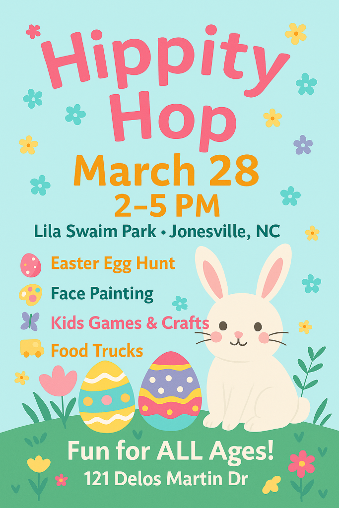 Held on Friday, March 28, Hippity Hop will take place from 2–5 PM at Lila Swaim Park in Jonesville, NC. This family-friendly event offers fun for all ages, including an Easter egg hunt, face painting, kids games and crafts, and food trucks. Admission is FREE! Join us at 121 Delos Martin Drive for an afternoon of springtime fun and community celebration.